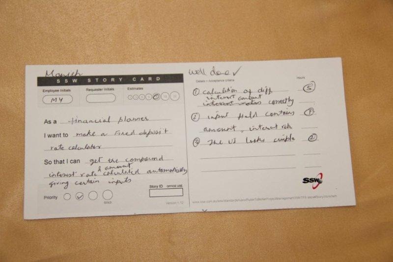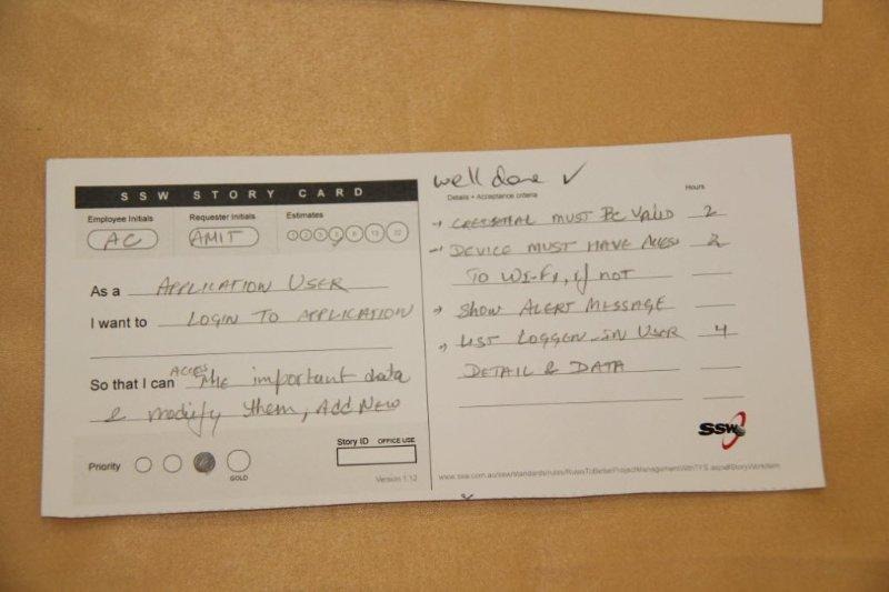 Adam C’s next instruction was for each student to write one of their current working items in the form of an SSW story card. Some were good, and some were not so good. I reviewed my favourite ones and shared them with the class.