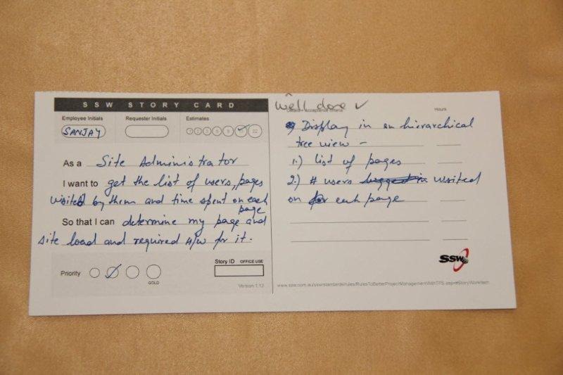 After a morning break, Adam Cogan spoke to the group about User Stories. Everybody loved his quintessential example with accompanying story:As a marketing manager I want to search for customers So that I can call them upHe followed this up with a discussion about Acceptance Criteria and why they were so important. Referencing the SSW rule on Acceptance Criteria, it was pointed out that you should never assume “gold plating” for a User Story. The group appreciated the clarification on acceptance criteria and agreed that it was important for clarity.