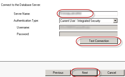 - Make sure we’re pointing at the correct SQL Server instance, and that testing the connection succeeds, then click Next
