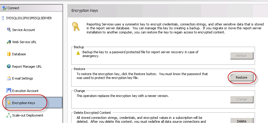 - Back up the Reporting Services Encryption Keys. We'll need to use these later to configure our new Reporting Services against the restored databases. To back up the encryption key, follow the steps on the MSDN page. Note: Make sure you remember the password you use to protect it with – you’ll need it later!