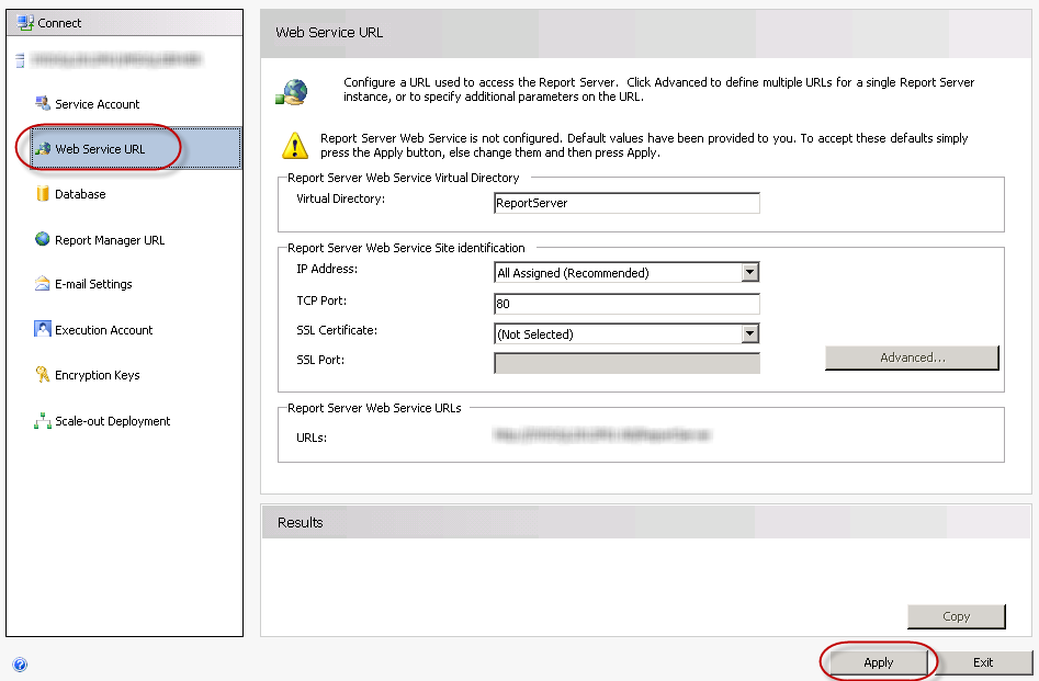 Note: If you’re unable to click Apply, you’ve probably already completed this step. Just skip this step. - Click on the Report Manager URL and Apply the default settings here as well. Again, check you get green ticks. Note: If you’re unable to click Apply, you’ve probably already completed this step. Just skip this step.