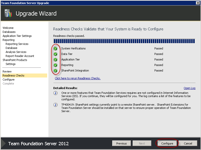 Configuration will take a little while, but when it's finished, make sure you get all green ticks then click Next. - Now each of the Project Collections will be updated. This includes a lot of stuff, so it may take some time.