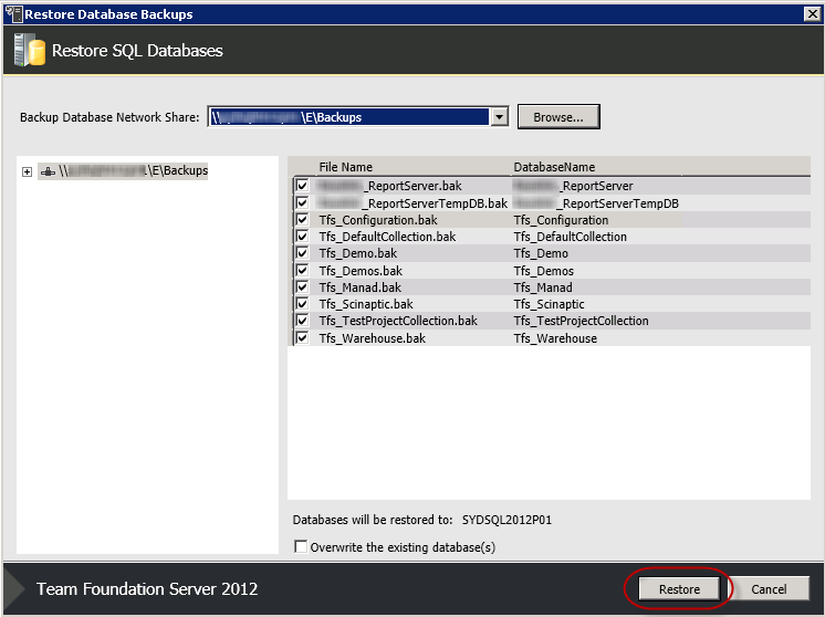 - We need to restore our TFS databases, so we’ll use the Database Restore Tool presented on the next screen.