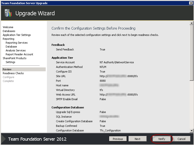 One thing we noted was that the URLs that were used to access the old TFS server were carried over in the configuration during the upgrade. While this was fine for us as we were changing DNS entries to keep everything consistent, I can imagine a common final step would be to change these URLs. It would have been nice for the wizard to prompt us for settings like that.