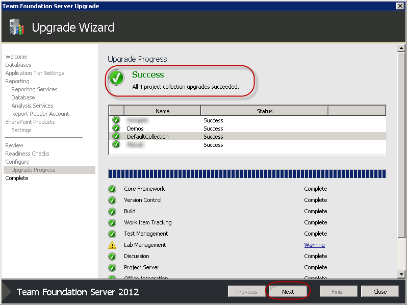 - Now, each of the Project Collections will be updated. If you're moving from RC, this should take no time at all.