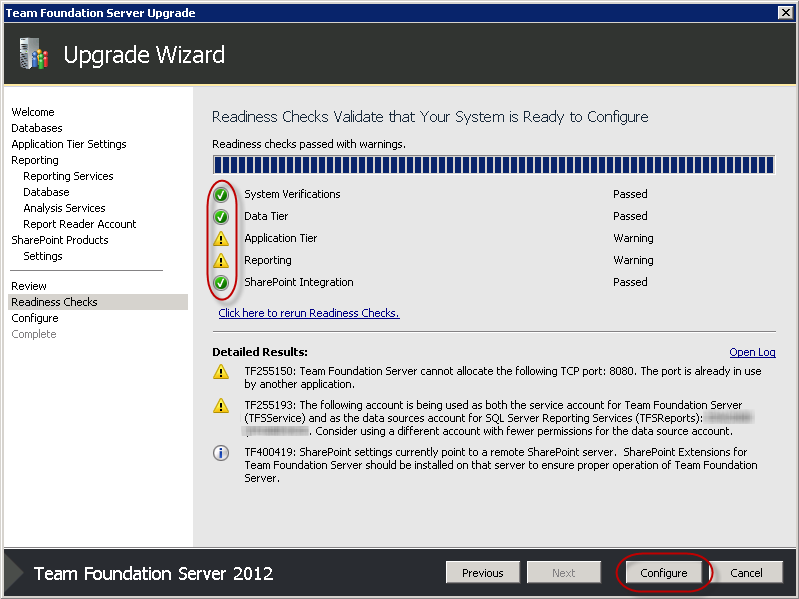 Note: You can see I have some warnings here. The first is because we're using a non-standard port. I'll be able to change that later. The second is letting me know I'm using a single TFS Account for two purposes. We've analysed this and are happy to take that risk. - Configuration will start now and may take some time. Maybe grab a coffee and have a chat with your neighbour. When it's finished, make sure you have all green ticks and then click Next.