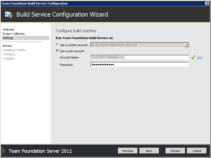 - After choosing your Project Collection, you're asked for your build service credentials. It's a good idea to have a separate account for builds, so I entered those details.