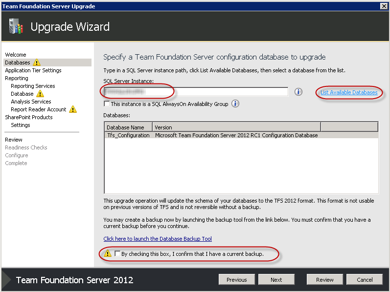 - We're now asked to upgrade an existing database. Type in your SQL Server instance name and then click List Available Databases. The tool should find your TFS Configuration database.