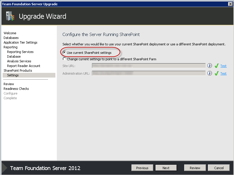 - Next we’re asked if we want to configure SharePoint for TFS, we do, so we’ll make sure the checkbox is checked and click Next.