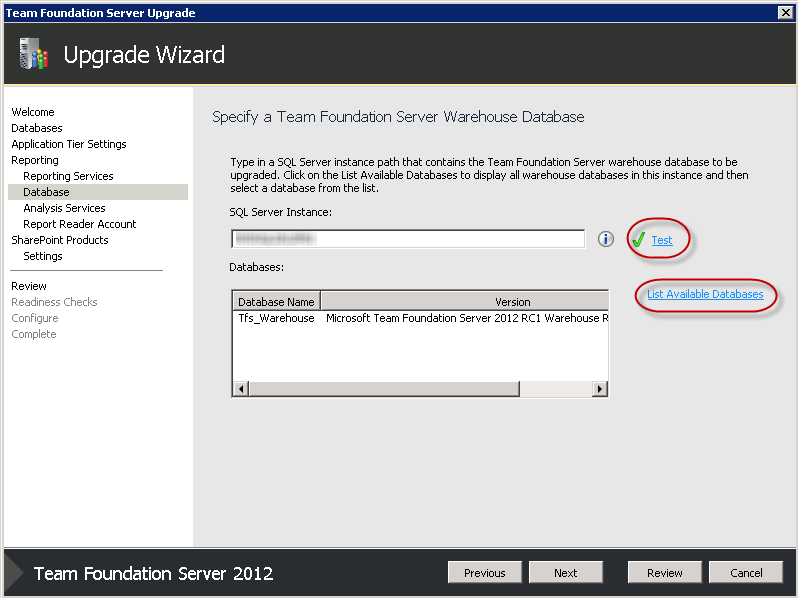 Enter the correct SQL Server instance (if it's not already correct), then test the connection by clicking on Test, then click List All Available Databases. The wizard will find the Tfs_Warehouse database automatically. If everything is correct, click Next.