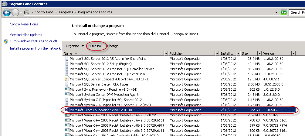 - Select Microsoft Team Foundation Server 2012 RC and click Uninstall