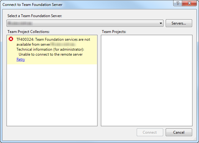 - Verify that you can’t connect to the TFS server by trying to connect in Visual Studio