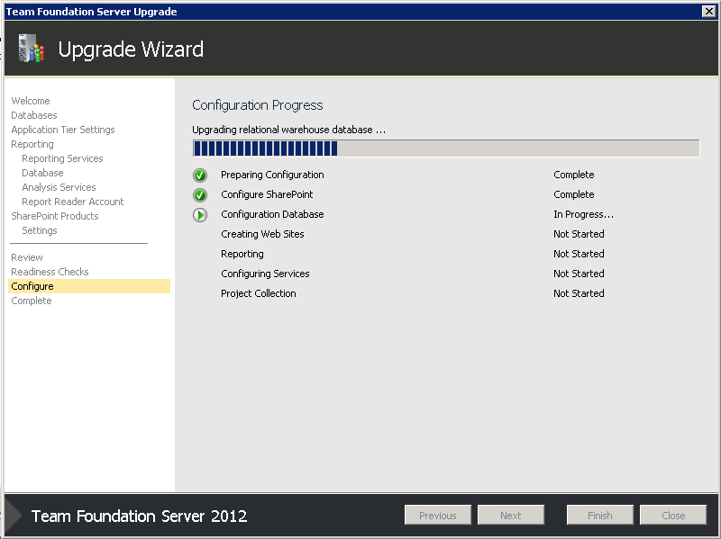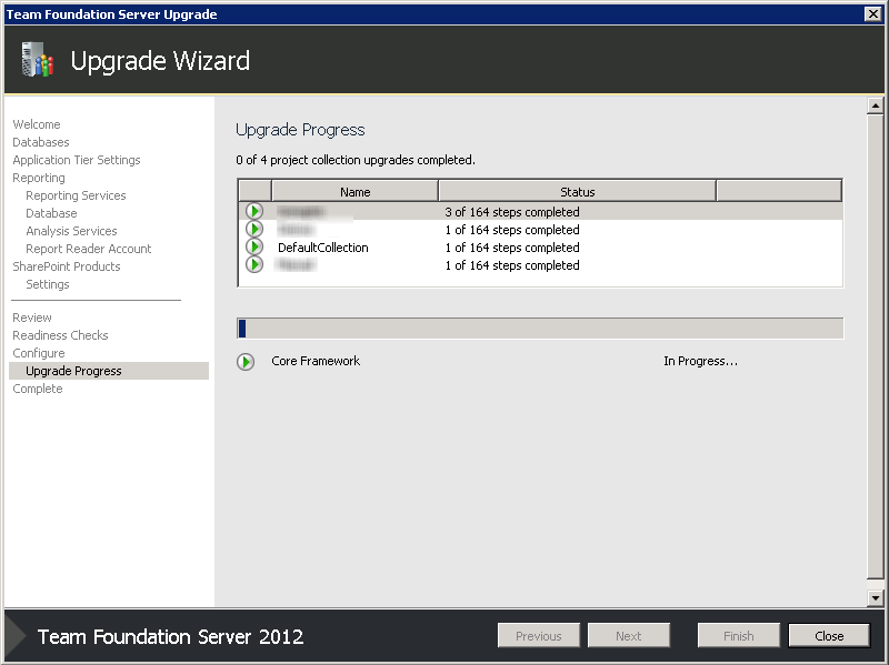 - Once the TFS upgrade has finished, the Upgrade Wizard will upgrade each of the Project Collections. Be patient while it does this.