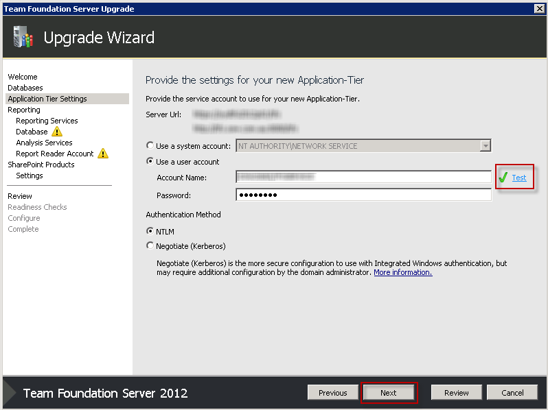 - Next, we’re asked for the service account for our Application Tier. Again, this should already be filled out. Once you've provided the password again, check it by clicking Test, then click Next.