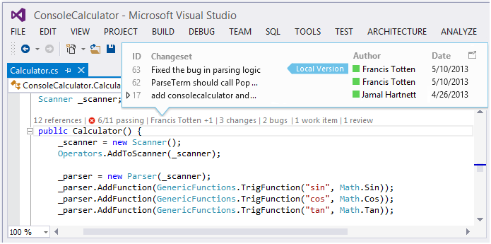 When you open a project in Visual Studio 2013, you'll notice a couple of additional bits of text above things like class methods and properties. These code lens helpers let you see at a glance, some really important information about the method or member below.You'll see: