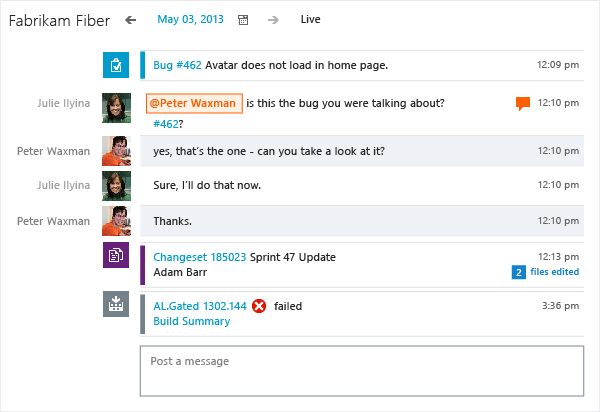 The addition of a team room to TFS adds some awesome collaboration features to Web Access. It's particularly useful for remote teams (which I work in a lot). Rather than just a chat room though, it can feed you information about your project. You can see build completions, changes to code, and updates to Work Items.
