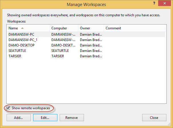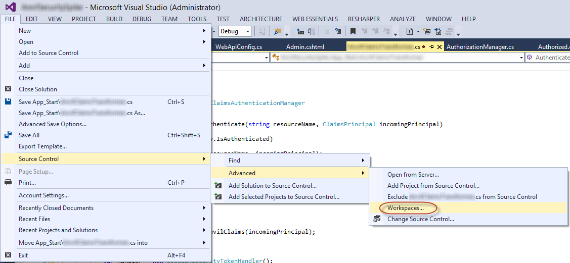- In Visual Studio, go to File | Source Control | Advanced | Workspaces...